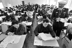 昨日早上剛到8:00,不少心急的考生已經(jīng)來到位于廣州城市職業(yè)學(xué)院廣園校區(qū)的交通協(xié)管員筆試考場(chǎng)。“年齡小、學(xué)歷高的并不占絕對(duì)優(yōu)勢(shì)。”交警支隊(duì)政治處副主任、昨日的副主考官張湘濤告訴記者,報(bào)名者中不乏一些大專、本科學(xué)歷的人士,還有一個(gè)碩士研究生,但無奈視力不好體檢關(guān)過不了,無緣筆試。