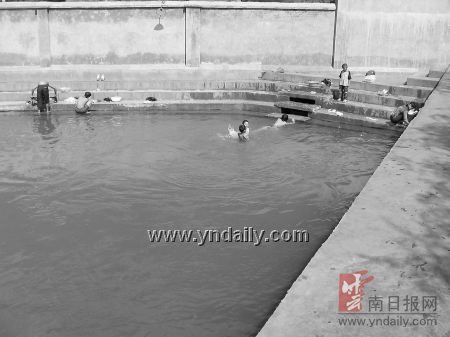 滇南武校內(nèi)有一個(gè)游泳池,但多年未用,泳池成了學(xué)生晾曬衣服的場(chǎng)地。游泳池的南側(cè)還有一池子,池內(nèi)的水就是從校外公路邊引來(lái)的龍?zhí)端3刈拥谋泵媸亲叩溃孛娓叱鏊婕s150厘米。池子的東、南、西3面都有臺(tái)階下到池底,學(xué)生們可以在這里洗衣服,當(dāng)然,練武的學(xué)生們也會(huì)在課后站到不深的池內(nèi)擦擦身子。