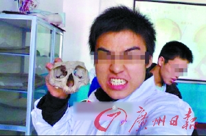 在一個有著大學(xué)實驗室裝修和陳設(shè)特點的房間里,幾個在上實驗課的身穿白大褂的醫(yī)學(xué)院男女學(xué)生,擺弄著人體骨架擺POSE拍照,其中一個長相清秀的女孩,頭頂半個頭骨做“皇冠”,右手則舉著一根骨頭作“權(quán)杖”狀,面對鏡頭露出燦爛微笑……