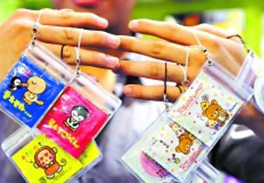 這些安全套有些是包裝上只有圖畫標(biāo)識(shí),沒有品牌名、廠家和保質(zhì)期等信息的“三無產(chǎn)品”。店主說,只要在安全套外包裝的邊緣上打個(gè)洞,穿上掛繩,就能將其做成手機(jī)繩或者各類背包的掛飾。而有的安全套的外包裝上還印著“御守”二字,系上細(xì)繩和小鈴就被當(dāng)成“護(hù)身符”出售,不同生肖、星座甚至都有各自相應(yīng)的款式。一問之下,這些安全套掛飾每個(gè)售價(jià)在20~25元左右,身價(jià)比平時(shí)足足“飆升”了至少5倍。