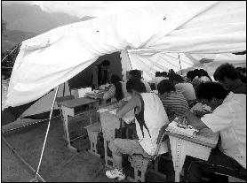 昨天下午,茂縣中學(xué)操場(chǎng)上架起了8個(gè)巨大的白色帳篷,帳篷上印有聯(lián)合國(guó)兒童基金會(huì)的藍(lán)色標(biāo)志。每頂帳篷里都坐滿了高三學(xué)生。為了散熱,帳篷兩側(cè)都被撩起來(lái)通風(fēng)。4點(diǎn)剛過(guò),喧鬧的帳篷內(nèi)頓時(shí)安靜下來(lái),其中一個(gè)帳篷里不久后傳出了一片讀書(shū)聲。旁邊的“教室”內(nèi)學(xué)生們安靜地做著卷子。記者悄聲問(wèn)坐在帳篷邊的一位女生上什么課,她悄聲回答:“地理。”
