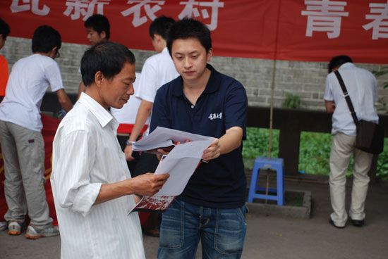 7月14日上午,適逢長(zhǎng)沙鎮(zhèn)趕集,開縣團(tuán)縣委聯(lián)合重慶工程職業(yè)技術(shù)學(xué)院大學(xué)生暑期三下鄉(xiāng)社會(huì)實(shí)踐團(tuán)在長(zhǎng)沙鎮(zhèn)開展改革開放三十年成就宣講服務(wù)活動(dòng)。當(dāng)日上午,三十名宣講成員冒著酷暑向過往群眾宣講,宣講活動(dòng)按思想建設(shè)、國(guó)防科技、百年奧運(yùn)、民主法制、社會(huì)民生等10個(gè)部分圖文資料生動(dòng)地展現(xiàn)了祖國(guó)改革開放三十年取得的巨大成就。駐足觀看的群眾絡(luò)繹不絕,在展覽前打起了傭堂,他們有的深情凝望圖片資料,有的和大學(xué)生攀談改革開放三十年來(lái)自己生活的變遷。