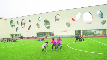 昨日下午,記者來到草堂小學翠微校區,4棟通過走廊連為一體的4~5層的建筑格外引人注目。正對學校大門的墻體,鑲著10多個彩色的橢圓。設計者、西南交通大學教授王蔚介紹說,翠微校區占地20余畝,建筑面積一萬余平方米,而總投資僅 2000多萬元。“這些彩色的橢圓圖案,代表著水滴。陽光下,‘水滴’呈現出不同顏色,這代表了學生們的不同個性。校舍以‘陽光下的水滴’為設計構思,充分表達了在我國素質教育的原則下,尊重個性發展,尊重少年兒童人格特征的理念。”