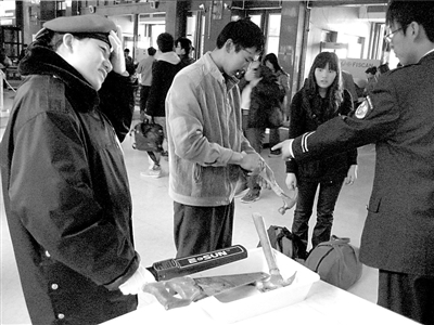 “根據現在的規定,您攜帶的錘子不得攜帶進站上車。”一名乘客在攜帶著錘子等工具通過安檢儀后,被安檢人員攔下。據安檢人員介紹,現在的安檢力度基本和奧運期間持平,像剪刀、大型水果刀等物品都是不允許攜帶上車的。旅客被查獲的物品,可暫時保存在進站口由其朋友領走,或直接辦理托運。