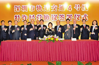 在18日的簽署儀式上,港鐵行政總裁周松崗與深圳市發(fā)展和改革局、交通局、國資委負(fù)責(zé)人先后簽署《深圳市軌道交通四號線特許經(jīng)營協(xié)議》、《深圳市軌道交通四號線建設(shè)標(biāo)準(zhǔn)及運(yùn)營期滿后移交標(biāo)準(zhǔn)之協(xié)議》、《深圳市軌道交通四號線運(yùn)營協(xié)議》、《深圳市軌道交通四號線一期設(shè)施租賃協(xié)議》共四份協(xié)議。