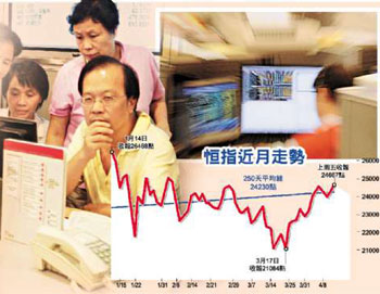 恒指上周累升403點(diǎn),收?qǐng)?bào)24667點(diǎn),是3月底以來(lái),連續(xù)三個(gè)星期錄得升市,升幅達(dá)到3558點(diǎn),但近期上升動(dòng)力有緩和跡象。例如當(dāng)大市低位時(shí),獨(dú)領(lǐng)群雄的匯控,近日升勢(shì)不繼。反而,內(nèi)地銀行股卻接力向上。