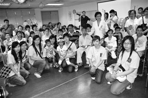 圖:代表團(tuán)一行與在穗治療的災(zāi)區(qū)兒童合影。(圖片來(lái)源:澳門(mén)日?qǐng)?bào))