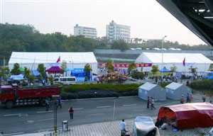 經(jīng)過兩日兩夜路程,捐贈物資于17日晚運抵地震重災(zāi)區(qū)之一的綿陽。在綿陽市教育局、值班警員、志愿者及體育館內(nèi)災(zāi)區(qū)民眾的大力協(xié)助下,經(jīng)過近30個小時,兩頂超大帳篷終完成安裝。