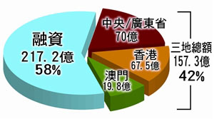 工程費用按大橋對三地的經濟效益攤分。連同廣東資本金在內,內地資本金一共70億元,香港出資67.5億元,澳門則出資19.8億元。三地的資本金額一共157.3億元,占大橋主體建設費約42%。按此推算,大橋主體總造價為374.5億元。余下的建設費將透過三地政府協議制訂合適可行的貸款融資方案解決。