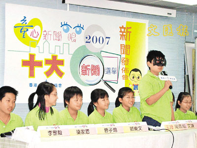 負(fù)責(zé)舉辦選舉的香港小童群益會(huì)第4屆“香港小特首”,上月分別通過(guò)表格及網(wǎng)上投票進(jìn)行“童心新聞眼2007十大新聞選舉”,吸引28996名小四到中三學(xué)生參與投票,從30則候選新聞中選出心中的十大新聞,榮獲首3名的新聞依次為“熊貓‘盈盈’、‘樂(lè)樂(lè)’抵港 慶祝回歸10周年”、“哈利波特大結(jié)局 風(fēng)靡全球”及“嫦娥一號(hào)發(fā)射成功 探月夢(mèng)想逐步成真”,分別取得18172票、16474票及15054票。