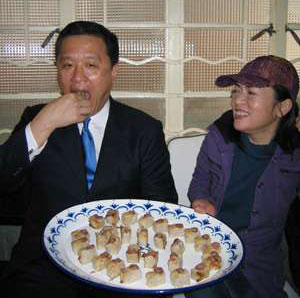 圖:在灣仔船街18號經(jīng)營的“鴛鴦飯店”主打有香港本土特色的懷舊菜,市建局主席張震遠(yuǎn)品嘗蘿卜糕后激贊叫好,飯店老板徐蒝眉開眼笑。(圖片來源:大公報)
