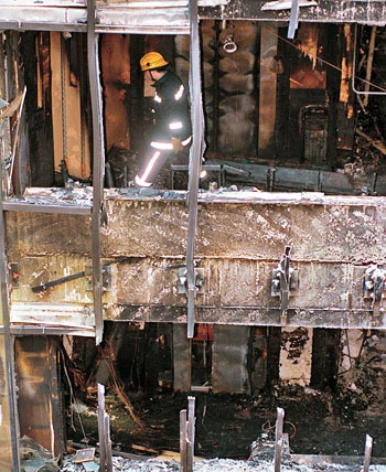 大火撲滅后,消防員進入火場調查。(圖片來源:蘋果日報)