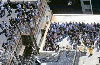 14日上午10時,蕭永方的妻女及親友,連同陳兆龍的父母、好友及其它消防員戰(zhàn)友,約170人抵達(dá)災(zāi)場地下,親友及旺角消防局人員先登上嘉禾大廈天臺,由于人數(shù)太多,部分人需站到相鄰的永如大廈天臺。