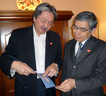 香港財政司司長曾俊華(左)在墨爾本,與亞洲開發銀行總裁Haruhiko Kuroda進行雙邊會議,并致送紀念品。(圖片來源:香港特區政府網站)