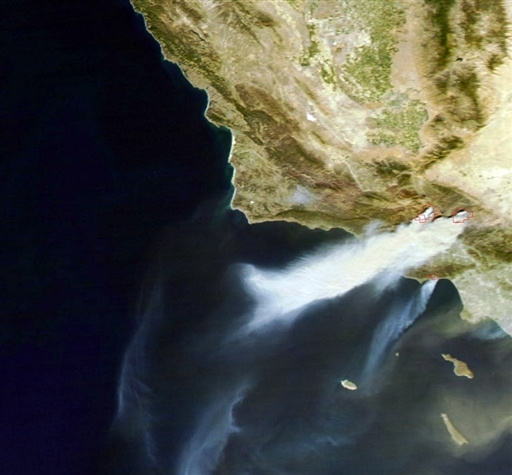 中新網10月23日電 美國加州近日多處發生山火,最少有9個火頭,圣迭戈縣有兩個,以北的海邊豪宅小鎮馬利布則有7個,加州州長施瓦辛格宣布7個縣進入緊急狀態。火頭逼近民居和一所大學,最少3.6萬人須疏散,其中不乏好萊塢明星。山火共計燒毀了最少3萬英畝的土地和39幢房子,1500名消防員參與撲救工作。圣迭戈的火警造成1死,最少17人傷,包括4名消防員。衛星拍攝到美國加州山火十分嚴重(見圖)。