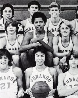 奧巴馬(第二排中間)在1977年高中時(shí)的照片。奧巴馬熱愛(ài)籃球,曾是學(xué)校籃球隊(duì)成員,大四時(shí)還隨隊(duì)獲州聯(lián)賽冠軍,作為一名前鋒擅長(zhǎng)左手投籃。可能因名字Obama發(fā)音的緣故,被隊(duì)友戲稱為轟炸機(jī)(O'Bomber)。