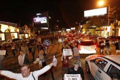 中新網(wǎng)11月6日電 綜合報(bào)道,加州數(shù)千名同性戀權(quán)利擁護(hù)者當(dāng)?shù)貢r(shí)間5日走上街頭,抗議加州通過的禁止同性婚姻提案。