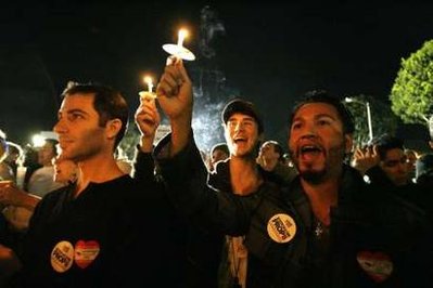 憤怒的人群擁堵在洛杉磯西好萊塢的同性戀聚集區(qū),揮舞標(biāo)語高喊口號(hào),表達(dá)不滿。一位抗議者裸露的胸前寫著:我是八號(hào)提案的受害者!