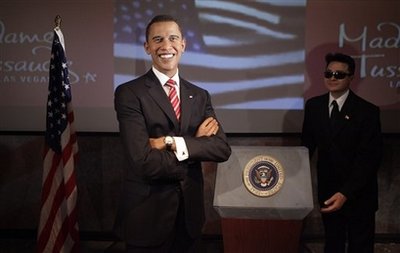 在美國紐約時代廣場的蠟像館,奧巴馬的蠟像正式與游客見面。奧巴馬的蠟像穿上深藍色西裝、配襯藍色的領帶及美國國旗襟章,雙手放在胸前,臉上掛有親切笑容,站在白宮總統(tǒng)辦公室布景中,造形神氣。