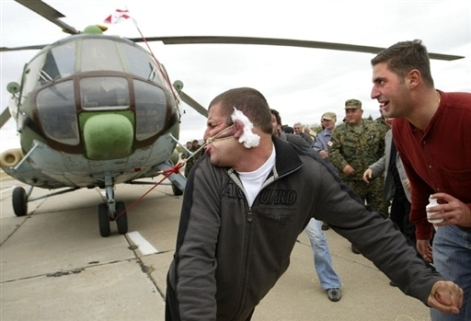 現(xiàn)年27歲的前摔跤冠軍拉沙•帕塔拉亞(Lasha Pataraya)搓了搓耳朵,在耳朵后面塞棉花,深深地吸了一口氣,開(kāi)始了他的超級(jí)大挑戰(zhàn),用耳朵拉動(dòng)米-8俄羅斯軍用直升機(jī)。