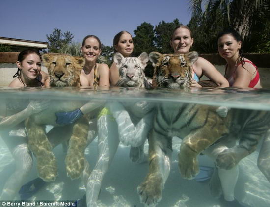據英國《每日郵報》報道,在海邊的游泳者要不時巡視海面以防大鯊魚,不過,對于美國南卡羅萊納州一家動物園的女訓獸師們來說,與小老虎們一起游泳已是她們的例行工作。