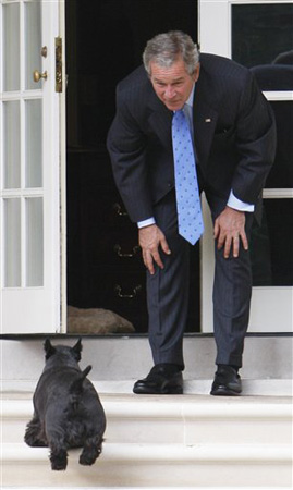 2007年9月28日,美國總統布什結束國務院的會議后,在白宮與他的小狗巴尼嬉戲。