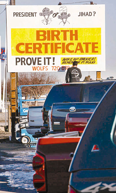 據(jù)香港《文匯報》22日報道,這幅廣告牌豎立于距離丹佛以西11公里的第70號州際公路旁,剛于前日由藝術家里爾完成。奧巴馬卡通肖像下有一個黃色大方格,上書“出生證書,請證明!“顯然在質(zhì)疑,奧巴馬是否真的在夏威夷出生及擁有美國公民身份。