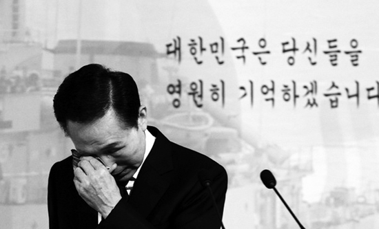 4月19日,韓國總統李明博就上月發生的“天安”號沉船事件發表電視講話。時長10分鐘的講話中,李明博既展現了態度強硬的一面,也有博人感情的首度落淚。