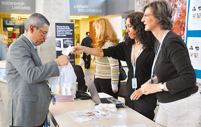 瑞士日內瓦的世衛總部,參加會議的代表在報名處領取贈品─消毒水和消毒紙巾。