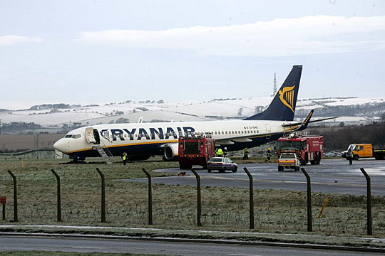 一架從都柏林起飛的波音七三七客機,在蘇格蘭西部的貝勒斯特威怡機場降落時,因為路面結冰而滑出跑道,飛機最后停在跑道西側的草坪邊緣。