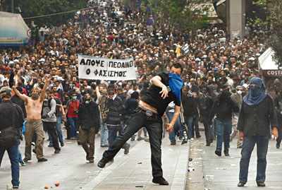 中新網(wǎng)5月6日電 希臘5日爆發(fā)全國(guó)性罷工及10萬(wàn)人大示威,抗議政府的財(cái)政緊縮政策。據(jù)香港《文匯報(bào)》報(bào)道,在首都雅典約60人試圖沖破警方的封鎖線沖擊國(guó)會(huì),警方揮動(dòng)警棍還擊,又施放催淚氣體。有銀行遭投擲燃燒彈放火焚燒,最少3名職員死亡,5人受傷送院,消防員疏散約20人。警方總動(dòng)員應(yīng)付局面,并宣布首都進(jìn)入戒備狀態(tài)。