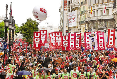 西班牙公務員前晚在全國發動60場大游行,抗議政府緊縮計劃。工會稱,全國260萬公務員中,3/4參加了示威,但政府指只占11%。首都馬德里有數千人參加游行,一名丈夫失業的女教師說,本月薪酬被削減150歐元,一想起便哭,家中儲蓄正被蠶食。