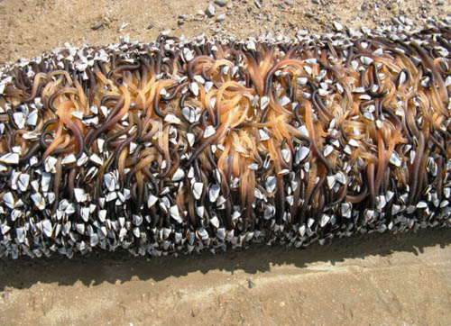 度假游客麗貝卡・波特以為自己看見了“一只活生生的大海怪”。她說:“它有兩米長,像電線桿子那么粗”,“事實上它們可能是我見過的最大型的飄浮的狗爪螺(又稱茗荷兒,鵝頸形藤壺)標(biāo)本”。經(jīng)專家驗證后,這個所謂的異星怪物原來是不計其數(shù)的狗爪螺。它們原本生活在海洋深處,受壞天氣影響從海里翻涌出來,并密密麻麻地附著在一塊木頭上隨波逐流,最終到達(dá)海灘,才成了這副模樣。