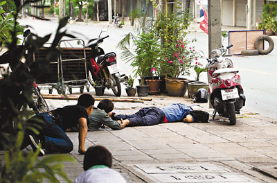 在示威區(qū),有居民自設(shè)圍欄,以免紅衫軍逃走時(shí)闖進(jìn)。部分居民更急急收拾細(xì)軟離開。46歲的拉達(dá)與女兒拖著行李離開時(shí)說:“他們關(guān)掉所有燈,我們已沒有食物……過去兩晚最危險(xiǎn),所以要離開。”