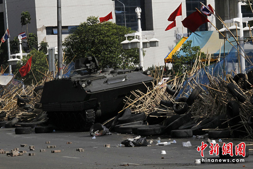中新網(wǎng)5月19日電 據(jù)外電報道,19日泰國軍方對聚集在首都曼谷市示威的反政府“紅衫軍”展開了驅(qū)散行動,據(jù)信軍方裝甲車已突破“紅衫軍”所筑路障,且至少有3人被槍擊中。