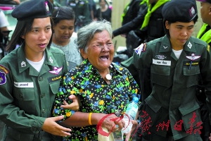 5月20日,一名年邁的紅衫軍成員在被警察帶離抗議現場時,潸然淚下。
