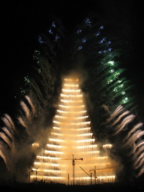 看點二是“強盛大國的火花”、“我們將勝利”兩場煙火晚會。4月14日晚,一場旨在紀念金日成主席誕辰97周年、宣誓邁向強盛國家的煙火表演照亮了平壤的夜空。隨著聲聲炮響,五顏六色、造型各異的美麗煙火依次騰空,把大同江上下游兩座橋之間的區域變成了煙火的海洋。朝鮮最高領導人金正日同志的出場令全場氣氛格外高漲,掌聲和歡呼聲回蕩在大同江的兩岸。有意思的是,13日、15日平壤下了兩場春雨,唯獨14日萬里晴好,給煙火表演留下了完美的時間窗口。5月1日在柳京大廈舉行的焰火晚會更具特色,巨大的樓體第一次流光溢彩,散發出美麗的火光,那神奇的景象讓人難忘。