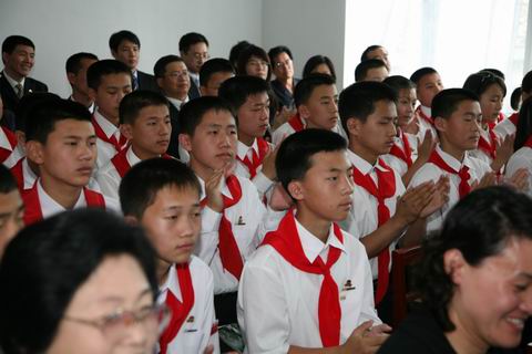 參觀結(jié)束后,劉大使一行與“毛澤東班”全體師生在學(xué)校禮堂舉行了紀念聯(lián)歡活動。東平壤一中校長康相福在講話中首先歡迎劉大使及北京五中代表團在“毛澤東班”命名50周年之際來到學(xué)校。他說,金日成主席和毛澤東主席為我們締造了朝中友好關(guān)系,兩國人民對他們懷有無限的敬仰之情。50年前的今天,在朝中兩國人民之間的戰(zhàn)斗友誼不斷加深之際,“毛澤東班”得以命名。自那時起,東平壤一中“毛澤東班”和北京五中“金日成班”開展了活躍的友好交流,為加深兩國青少年及兩國人民間的友好感情作出了貢獻。每逢重要節(jié)日,“毛澤東班”和“金日成班”的師生們總會互致問候。去年,東平壤一中代表團訪華,參加了北京五中建校80周年慶祝活動。明年將是“金日成班”命名60周年。相信兩校兩班將為朝中友誼的不斷發(fā)展做出積極貢獻。