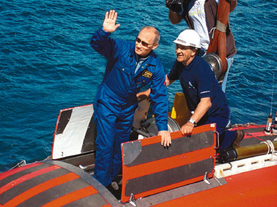 根據國營電視臺發出的照片,可見身為柔道黑帶高手的普京身穿藍色工作服,攀上Mir-1潛艇開始航程。普京在船艙表示:“這次潛水很順利,視野在燈光下很好。”但他對水顯得污濁有微言:“從生態角度看這些水當然干凈,但事實上這是浮游生物湯,起碼我是這樣叫它。”