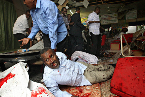 中新社北京十二月四日電 摩加迪沙消息:當地時間三日,一名男扮女裝的自殺式襲擊分子在索馬里首都摩加迪沙城南一家飯店引爆炸彈,已造成至少二十二人死亡,數百人受傷。死者當中包括索馬里過渡政府多位部長、記者以及當時正在酒店舉行畢業典禮的大學生。