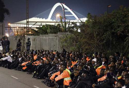 約150名的保安人員從摩西馬比哈達球場附近出發(fā),一路載歌載舞行進到繁華的市中心。隨著不斷人數(shù)的不斷加多,示威者又有秩序地返回到球場,守候在那里的數(shù)十名警察將他們控制在一片隔離區(qū)域。