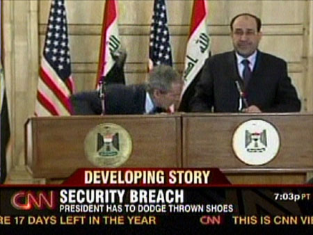 12月14日,還有37天即將卸任的美國(guó)總統(tǒng)布什突訪伊拉克。當(dāng)天下午,在與伊拉克總理馬利基一同出席的新聞發(fā)布會(huì)上,兩位領(lǐng)導(dǎo)人剛握完手,扎伊迪突然跳起,將自己腳上的兩只鞋子脫下,連續(xù)向布什砸去。雖然布什低下頭靈敏地躲過(guò)了飛來(lái)皮鞋,但扎伊迪的兩只皮鞋還是重重地砸在了布什身后的美國(guó)國(guó)旗上。