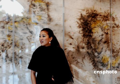 圖為關(guān)穎珊欣賞世界著名中國(guó)藝術(shù)家蔡國(guó)強(qiáng)的火藥爆破殘燼描繪畫(huà)作《中箭之虎》,畫(huà)面表現(xiàn)千箭貫穿的九只老虎在空中飛騰扭轉(zhuǎn)的情態(tài)。