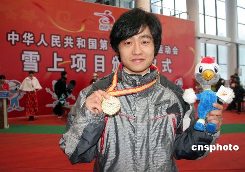 2008年1月23日上午,男子K90M個人跳臺滑雪開始比賽,全國冬運會第六天哈爾濱亞布力滑雪場下起了小雪,對此項比賽有所影響。通化市運動員田占東一跳奪冠,二三名分別被通化市另外兩位運動員李洋和王建勛獲得。中新社發(fā) 姚庭山 攝