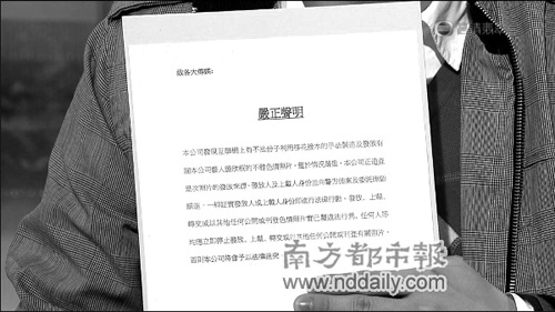 本公司發現互聯網上有不法分子利用移花接木的手法制造及發放有關本公司藝人鐘欣桐的不雅色情照片,鑒于情況嚴重,本公司正追查是次照片的發放來源、發放人及上載人身份并向警方備案及委托律師跟進,一經證實發放人或上載人身份即進行法律行動。發放、上載、轉交或以其他任何公開或刊登色情照片實已屬違法行為,任何人等均應立即停止發放、上載、轉交或以其他任何公開或刊登有關照片,否則本公司將會予以法律追究。