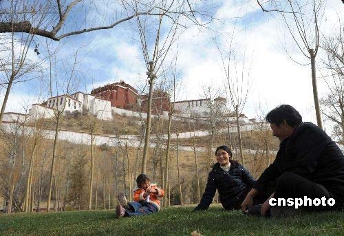 3月20日,拉薩市一個(gè)三口之家在布達(dá)拉宮下的宗角祿康內(nèi)休閑娛樂(lè)。