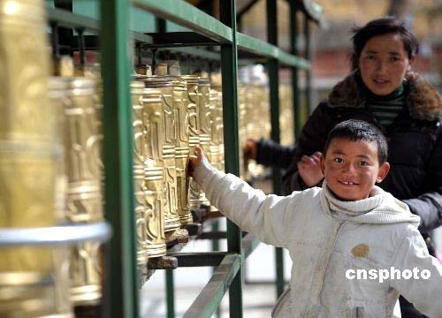 3月20日,一名可愛(ài)的拉薩兒童在布達(dá)拉宮北側(cè)轉(zhuǎn)經(jīng)。