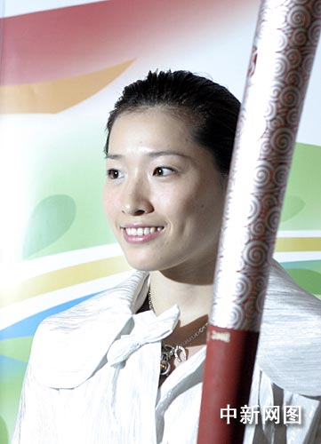 北京奧運會火炬希臘傳遞的第一位中國火炬手羅雪娟3月23日晚身著白色禮服出席晚宴,圖為其手持祥云火炬接受媒體拍照。中新社記者:王歡