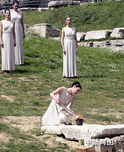 希臘當地時間3月24日,北京二00八年奧運會圣火采集儀式在古奧林匹亞競技場舉行,最高女祭司用順利采集到火種引燃手中的火炬。中新社記者 王歡