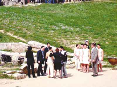 最激動人心的時刻即將來臨,最高女祭司娜芙普利都將在赫拉神廟的凹面鏡前點燃奧運圣火。從古競技場到圣火采集地的赫拉神廟的路上,中間有一個通道,“禁地”前可謂戒備森嚴,只有少數VIP貴賓才能進入。這時,章子怡也想起身近距離觀看點火儀式,但在通道前被安保人員攔住。他們顯然沒弄清楚這位美女的身份,很疑惑地看著章子怡,身邊的2008北京奧運官方電影工作人員則趕忙解釋:“super star”(超級巨星)。但胸前只是掛著記者證,并非VIP證的章子怡,盡管舉著證交涉了半天,還是被攔在了赫拉神廟之外。